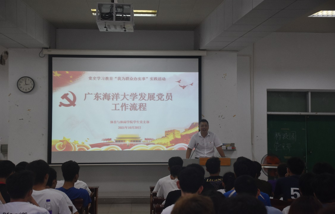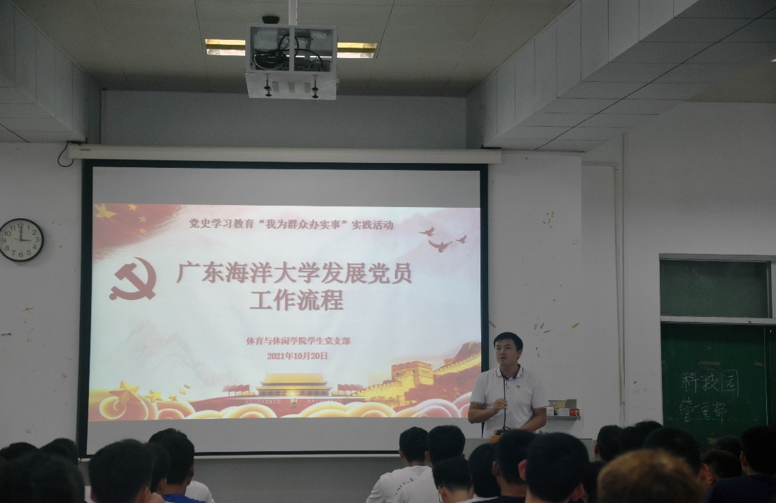 学生党支部书记夏慈忠以“发展党员工作流程”为主题,从入党申请、入党积极分子的确定和培养教育、发展对象的确定和考察、预备党员的接收、预备党员的教育考察和转正等五个环节,为同学们讲解了学校发展党员工作的全过程,并详细解答了入党所需的3投票、5公示、1答辩及3备案的内涵和要求。