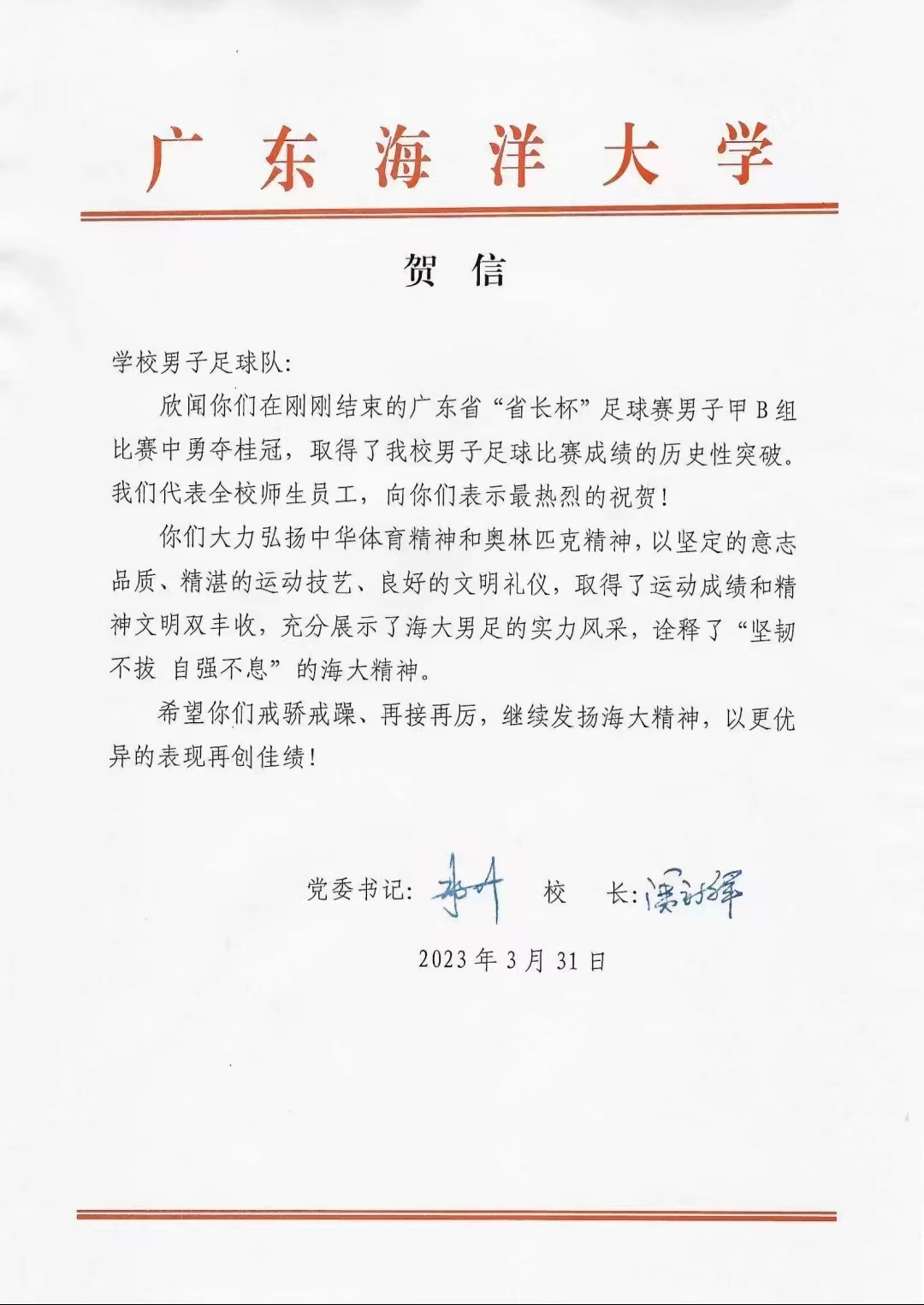 动漫在线 足球队在学校领导的大力支持下,积极备战,奋力拼搏,经过7场比赛的激烈角逐,荣获冠军,为学校争得荣誉,学校党委书记杨洲、校长潘新祥为此写了贺信。