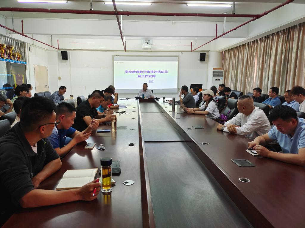 在湖光校区体育馆110室召开教育部关于开展新一轮本科教育教学审核评估工作动员会,学院全体教职工共60余人参加会议。会议由学院党委书记李新华主持。