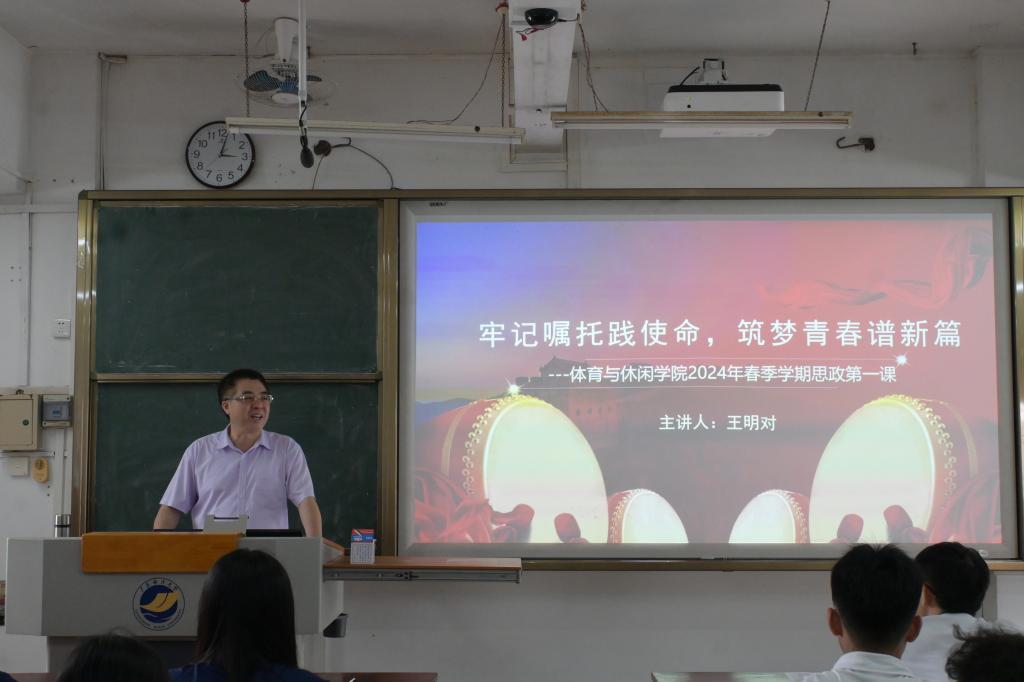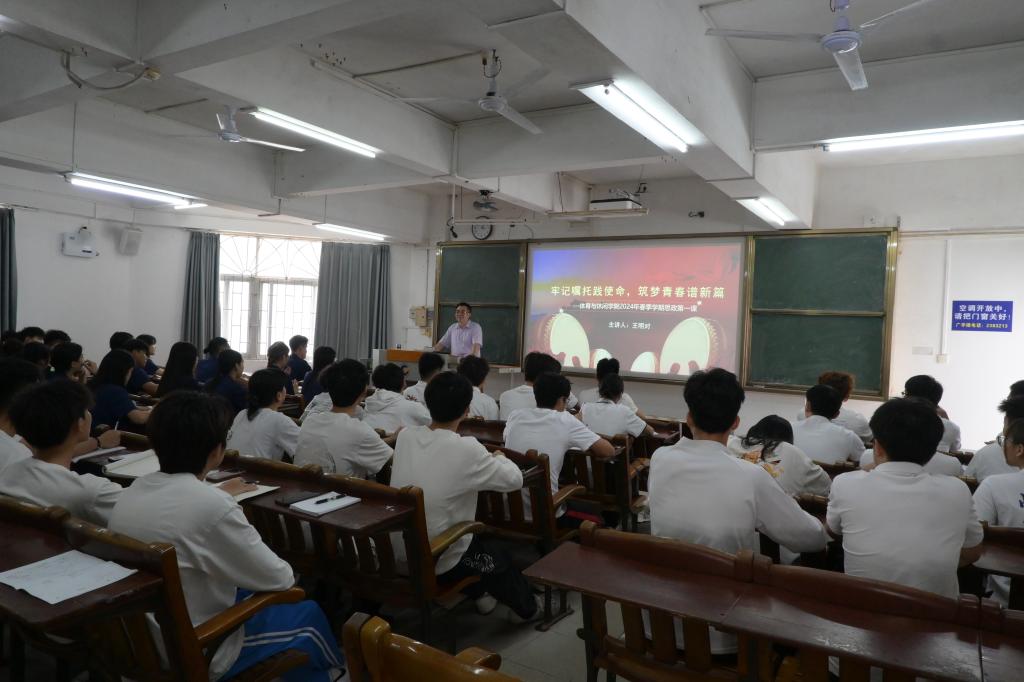 于2024年3月27日下午在广学楼222教室开讲2023-2024学年春季学期思政第一课,学院全体学生党员、党员发展对象、入党积极分子、第七期“青马班”学员以及学院团委学生会干部约80余人参加了学习。本次思政课由学院党委书记王明对主讲。
